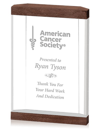 客製化水晶獎盃若使用到實木材料時,使用機械切割機和雷射切割機並搭配電腦軟體輸入數據,使用機器於木材表層雕刻,使用機械切割機雕刻出的圖樣及字樣為木頭之原色,雷射切割機雕刻出之圖樣為燒酌顏色,使用機械切割機較為環保,雷射切割機質感較佳。此種手法優點為:漂亮美觀、減輕客製水晶盃重量。