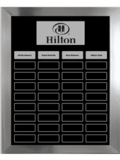 一個簡單而優雅的永久銘牌,帶有銀色飾面框架、黑色啞光和 36 個永久銘牌開口。您可以選擇啞光顏色。額外的雕刻、標識和設置費用適用。
