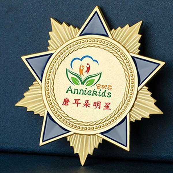 把圖樣或文樣內容放置於一片金屬片上,再黏至客製化水晶獎盃表面的手法,此手法由金屬片材質的選擇可分成金屬蝕刻片、金屬印刷片、金箔印刷片。此種手法優點為:金屬蝕刻效果及耐久最好,能夠長期收藏;金屬印刷片有較多顏色可選擇,生產更快,造價相對更低;金箔片造價低,生產快。