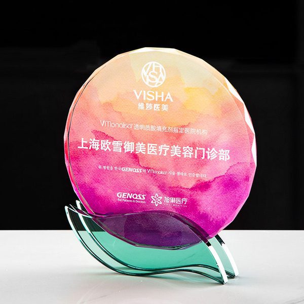 使用UV機器在水晶獎盃表層印製圖樣與字樣,能夠印製漸層色及白色,表層有UV層覆蓋,能夠於水晶獎盃正或反面印製,正面印製時3D效果突出,反面印製則色顏色飽滿清楚。並且於彩色底下或表層印製白色底能讓顏色更為鮮艷亮麗。此種手法優點為:顏色相較彩色印製手法更耐久,顏色亮麗,視覺3D感強。缺點為:非同批印製時可能有顏色落差,白色色準較差可能有毛邊。